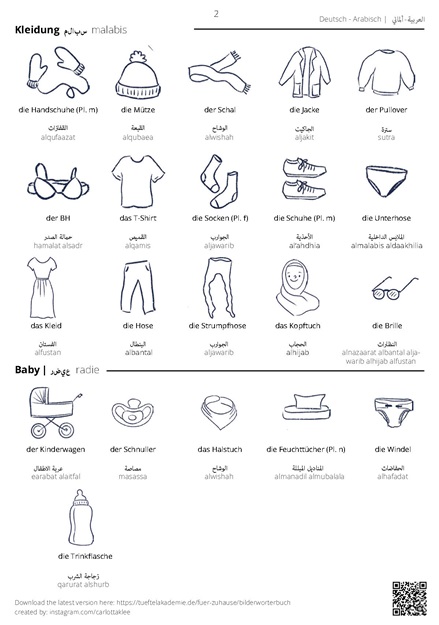 Das Wörterbuch beinhaltet Bilder und Wörter zu den Themen Kleidung, Baby, Hygieneartikel, Haushalt, Küche, Badezimmer, Schule und Konversation. Die arabischen Wörter sind in der Lautschrift dargestellt (Tüftel-Akademie).