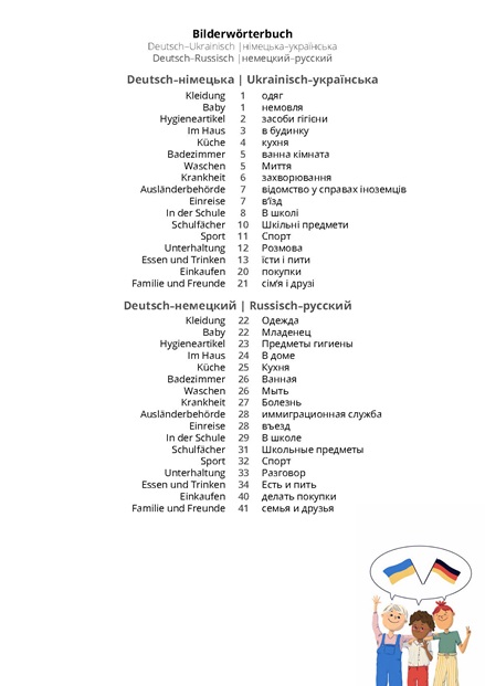 Das Wörterbuch beinhaltet Bilder und Wörter zu den Themen Kleidung, Baby, Hygieneartikel, Haushalt, Küche, Badezimmer, Schule und Konversation. Sowohl deutsche als auch ukrainische und russische Wörter sind ebenfalls in der Lautschrift dargestellt (Tüftel-Akademie).